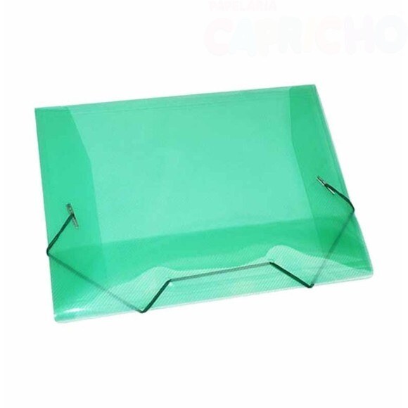 Modelo confeccionado em material plástico colorido dispõe de elásticos para facilitar o seu fechamento e aba para garantir que os papéis não caiam da pasta.