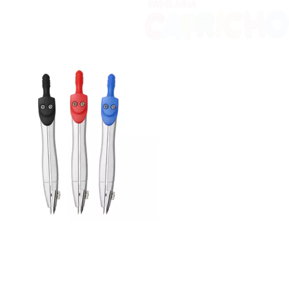 grafite para traçar as circunferências. O compasso conta com regulagem de abertura para maior precisão.