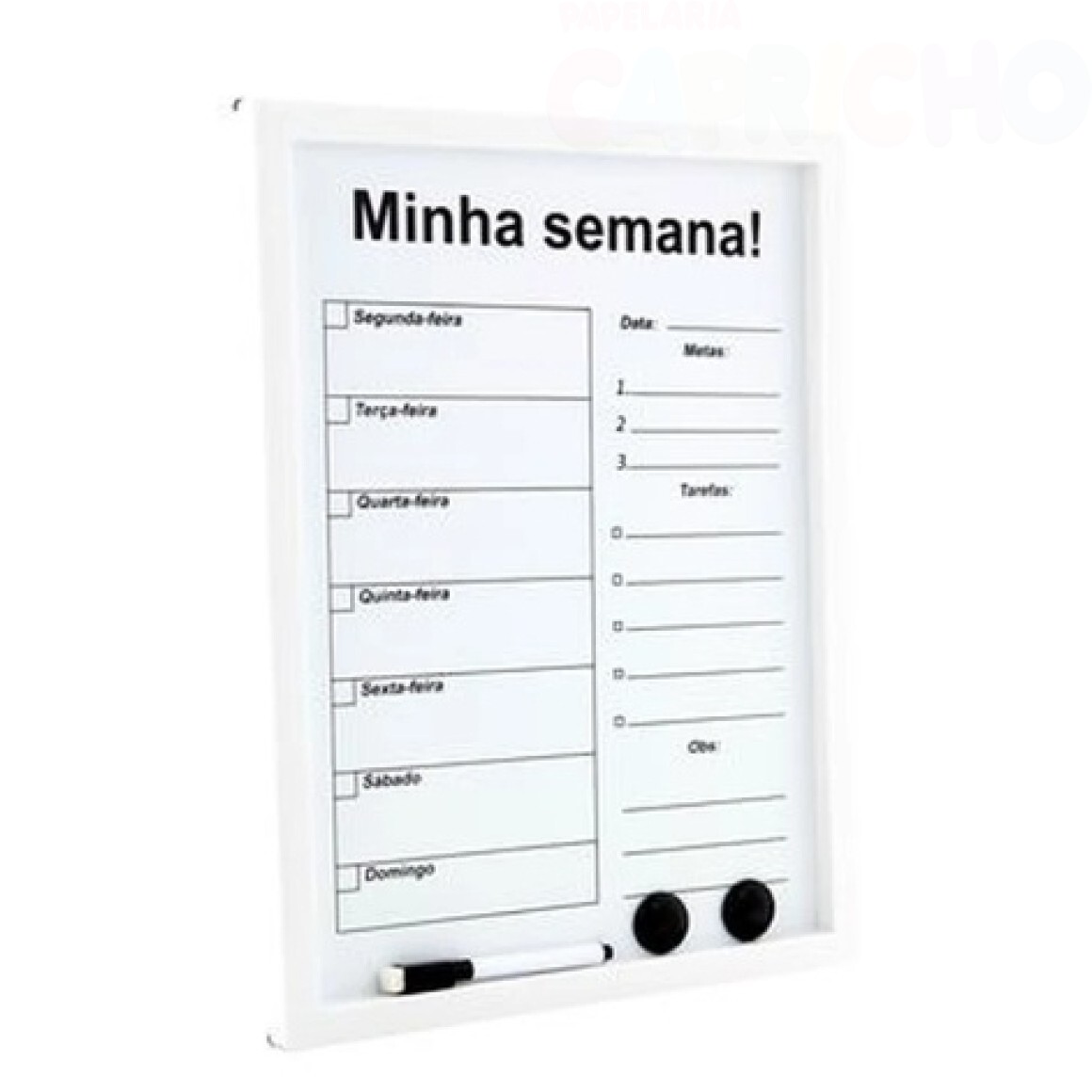 Quadro de Planejamento Semanal Magnético, acompanha 2 botons magnéticos e uma caneta com apagador na ponta .